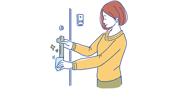 やわらかい布に除菌アルコール、0.05%の次亜塩素酸ナトリウム水溶液(薄めた漂白剤)または0.05%~0.2%の界面活性剤(薄めた家庭用洗剤)をしみ込ませ、レバーハンドル、ノブ、プッシュグリップなどを拭いた後、水で拭き上げてください。